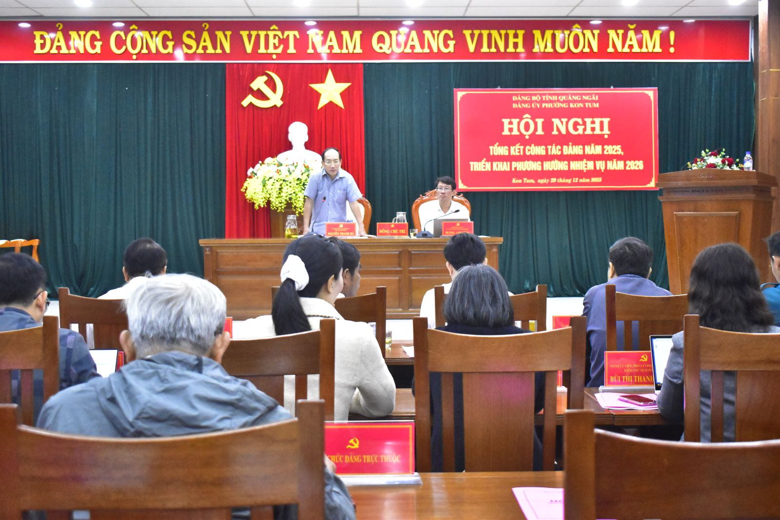 Sáng ngày 29/12, Đảng uỷ phường Kon Tum tổ chức hội nghị tổng kết công tác năm 2025, triển khai phương hướng nhiệm vụ năm 2026. Có đồng chí Nguyễn Thanh Hà- Uỷ viên Ban Thường vụ Tỉnh uỷ, Bí thư Đảng ủy, Chủ tịch HĐND phường và Dương Anh Hùng- Phó Bí thư Đảng uỷ, Chủ tịch UBND phường đồng chủ trì hội nghị.