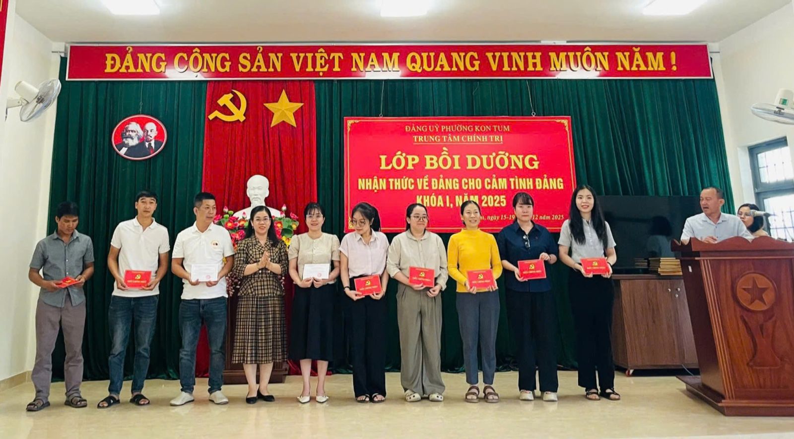 Chiều ngày 19/12/2025, Trung tâm Chính trị phường Kon Tum tổ chức bế giảng lớp bồi dưỡng nhận thức về Đảng khoá I năm 2025. Về dự bế giảng trao giấy chứng nhận hoàn thành khoá học có đồng chí Huỳnh Thị Thuý Hà, Phó Bí thư Thường trực Đảng uỷ phường Kon Tum.